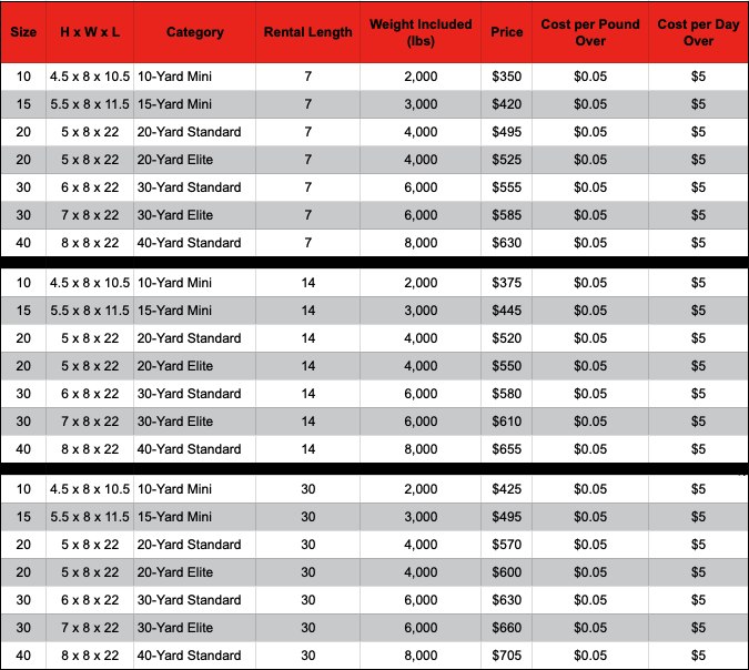 Example: renting a 10-yard dumpster for 7 days would be $350 and would include 2,000 lbs of weight. If you happen to go over the 2,000 lb allowance, it will $0.05 per lb. To extend your rental, it will be an additional $5/day.